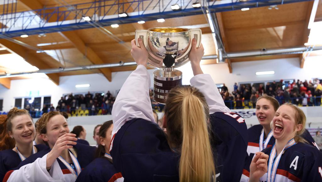 ZLIN, CZECH REPUBLIC – JANUARY 14: Team USA celebrates with the trophy after defeating Canada during gold medal game action at the 2017 IIHF Ice Hockey U18 Women’s World Championship. (Photo by Andrea Cardin/HHOF-IIHF Images)